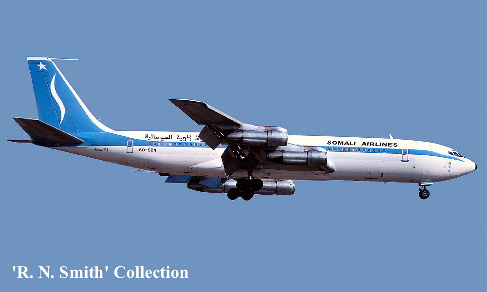 On This Day - November 24, 1984. The ex-Qantas Airways Boeing 707-338C VH-EBR, now being operated by Somali Airlines as 6O-SBN, was hijacked whilst en-route from Mogadishu (Somalia) to Jeddah (Saudi Arabia). On landing at Jeddah the hijackers surrended and the aircraft was released undamaged. |