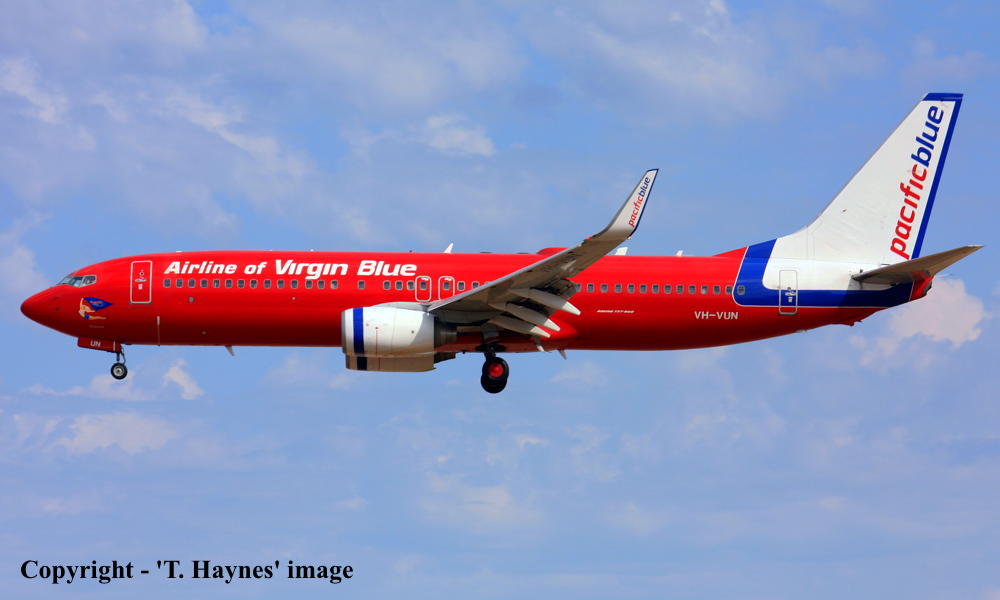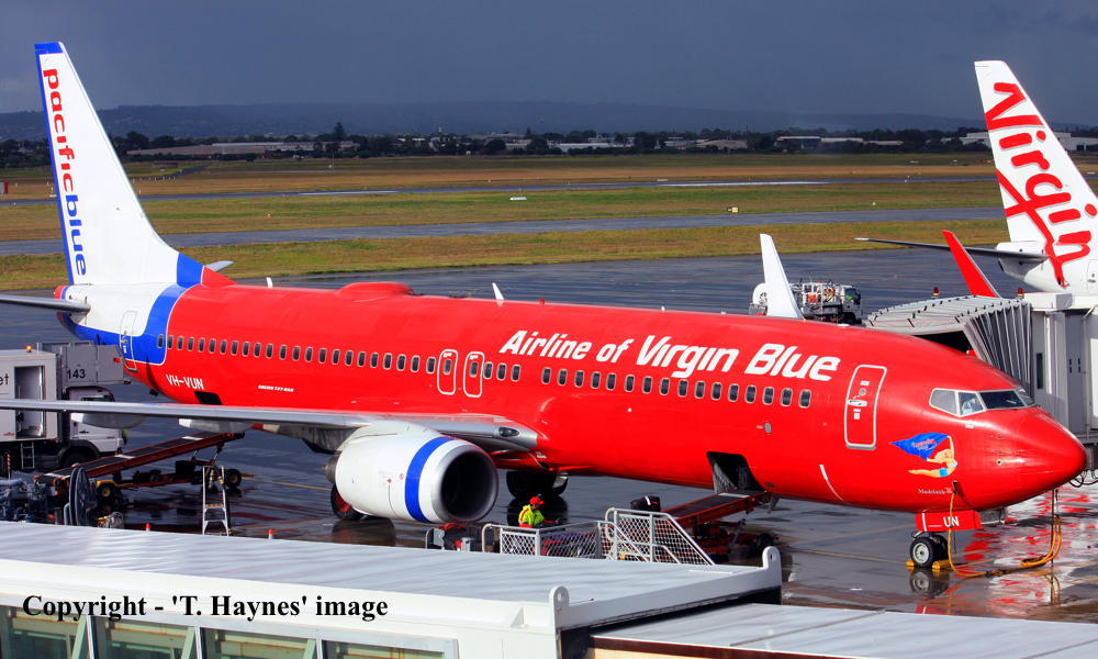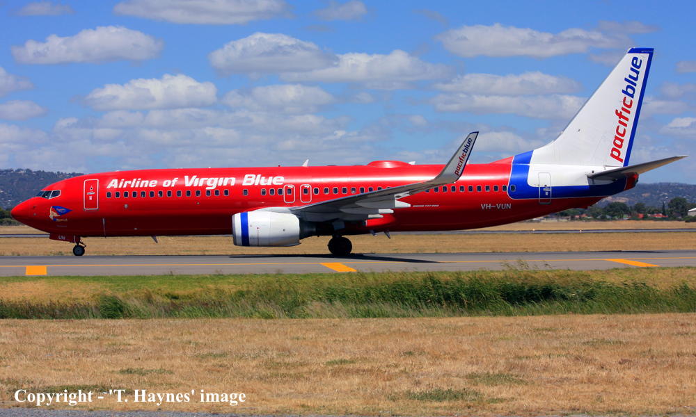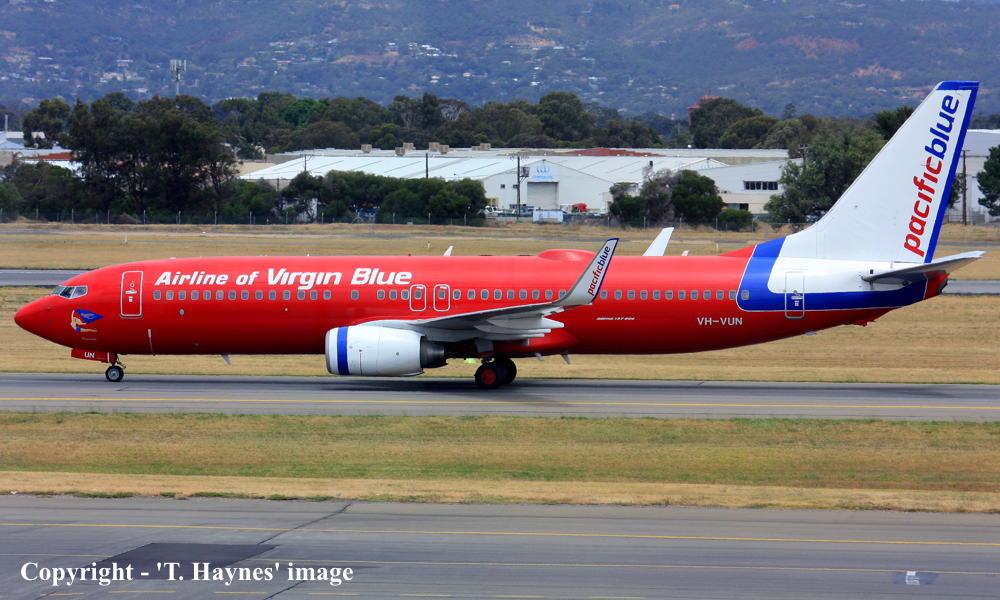VH-VUN. Pacific Blue - Airline of Virgin Blue - 'Madelaide' in the revised livery at Adelaide West Beach Airport, January 26, 2013. (T. Haynes Copyright Image 4623-785.) |