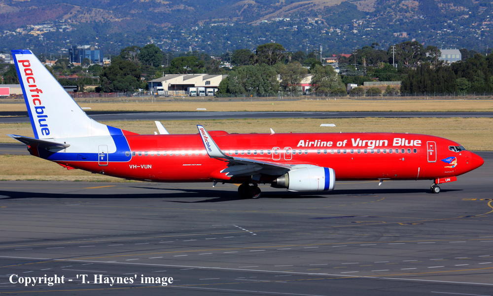 VH-VUN. Pacific Blue - Airline of Virgin Blue - 'Madelaide' in the revised livery at Adelaide West Beach Airport, January 27, 2014. (T. Haynes Copyright Image 4623-786.) |