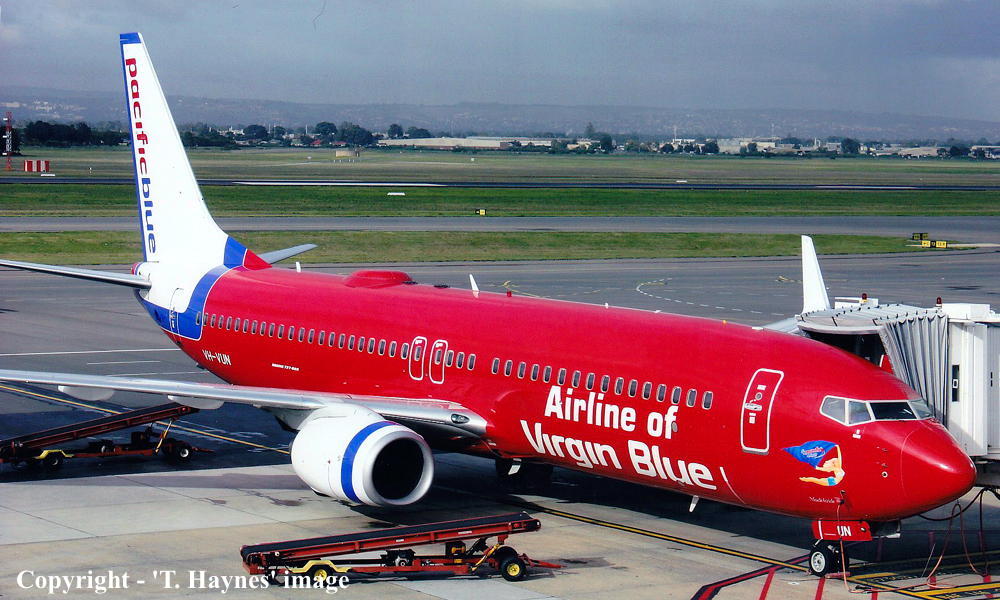 VH-VUN. Pacific Blue - Airline of Virgin Blue - 'Madelaide' in the revised livery at Adelaide West Beach Airport, date unknown. (T. Haynes Copyright Image 4623-787.) |