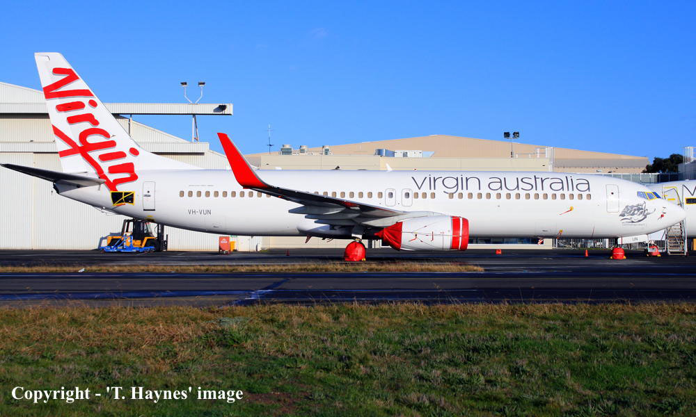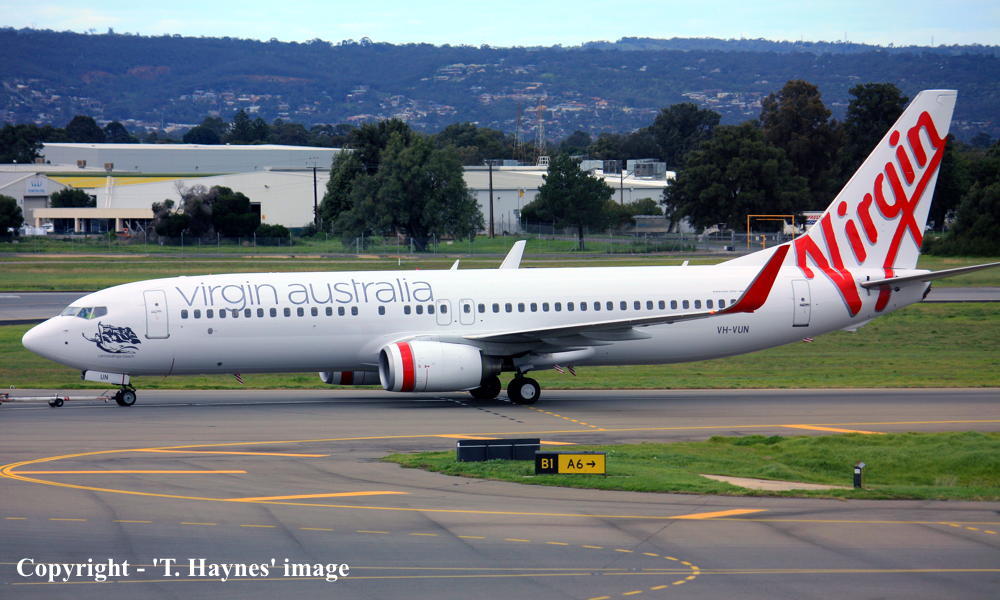 VH-VUN. Virgin Australia - 'Carrickalinga Beach' in the standard livery at Melbourne Tullamarine Airport, July 26, 2015. (T. Haynes Copyright Image 4623-790.) |