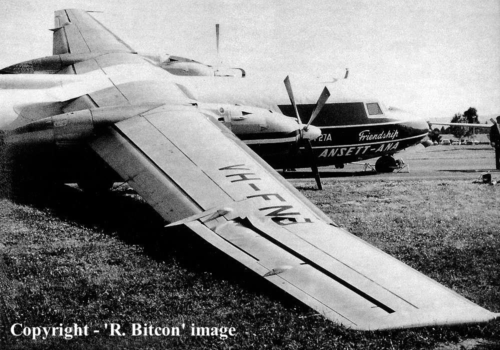 On This Day - December 11, 1962. The Ansett-ANA Fokker F.27-2013 Friendship VH-FNB was badly damaged whilst landing at Canberra (A.C.T.). The right landing gear retracted during the landing roll, causing the right wing-tip to buckle upwards when it struck the ground. The aircraft was repaired and returned to service. |