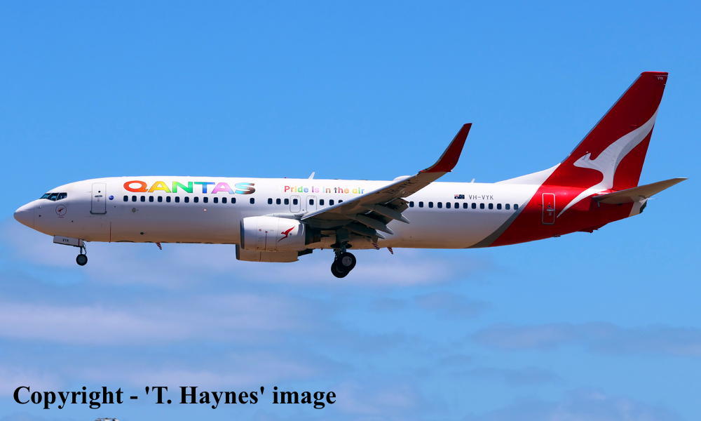 The Qantas Airways Boeing 737-838 VH-VYK 'Mooree' returned to service operating Flight QF609 from Brisbane (Queensland) to Melbourne (Tullamarine) after acquiring the 'Pride' livery during its maintenance lay-up at Brisbane.