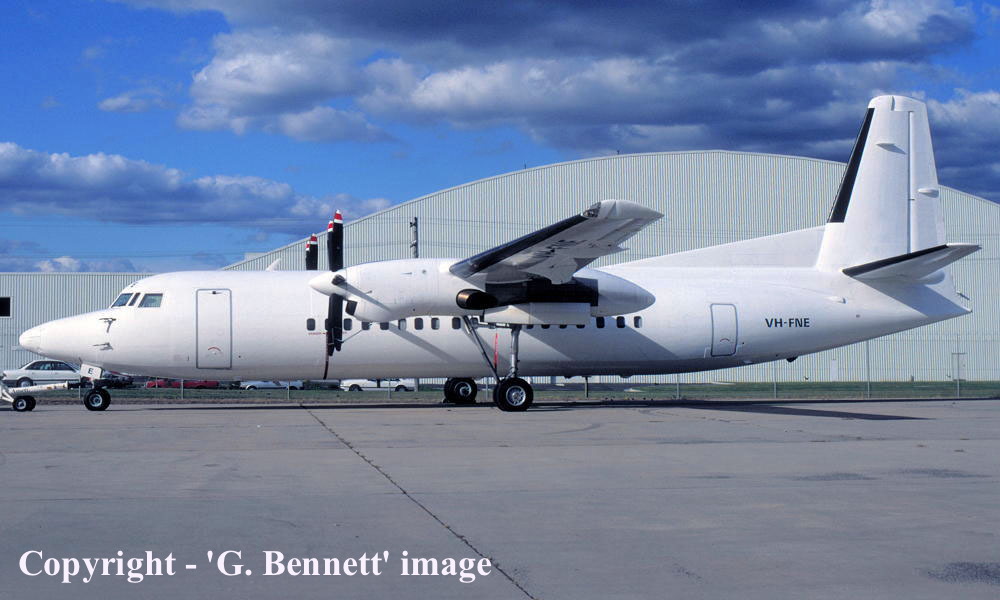 The Ansett Fokker F27-050 VH-FNE was ferried from Brisbane to Melbourne (Tullamarine) in an 'all-white' livery for storage pending its possible sale to Rajair, India. Although the aircraft was subsequently repainted into the standard 'Rajair' livery, the sale did not proceed.