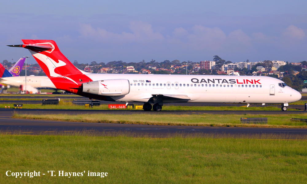 VH-YQS. QantasLink - in the 'New Roo' livery at Sydney Kingsford Smith Airport, March 10, 2014. (T. Haynes Copyright Image 4660-602.) |