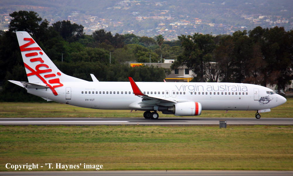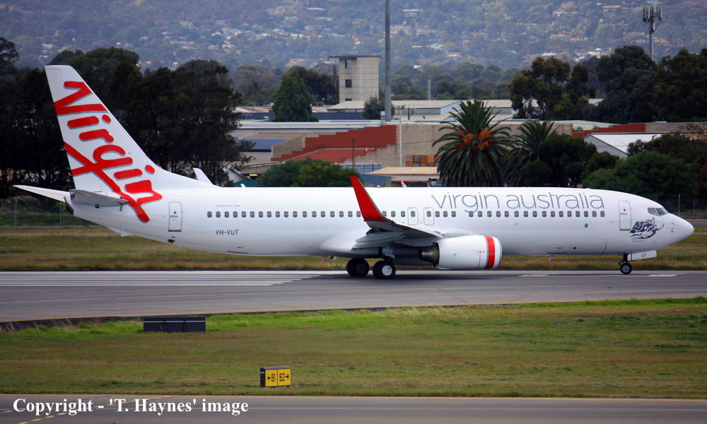 VH-VUT. Virgin Blue - 'Yabba Dabba Blue' in the standard livery at Adelaide West Beach Airport, March 01, 2014. (T. Haynes Copyright Image 4623-792.) |
