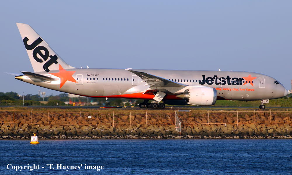VH-VKF. Jetstar - in the standard livery at Sydney Kingsford Smith Airport, March 29, 2024. (T. Haynes Copyright Image 4680-208.) |