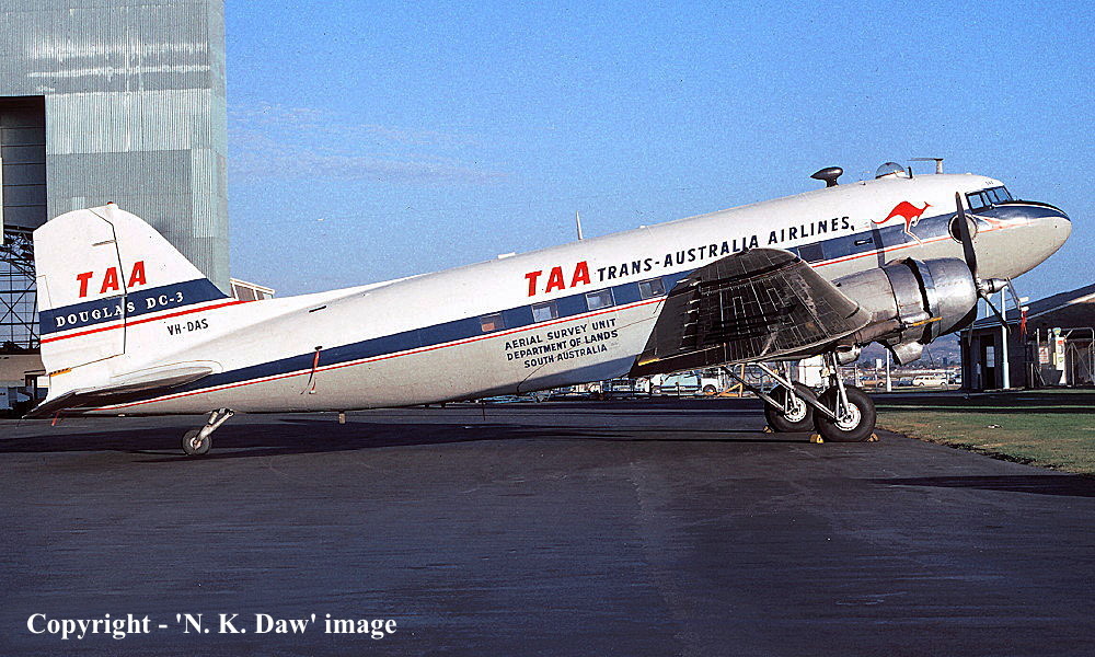 VH-DAS. TAA Trans-Australia Airlines - 'Cunningham' in the standard livery with additional 'Aerial Survey Unit Department of Lands South Australia' titles at Adelaide West Beach Airport, December 1971. (R. N. Smith Collection Copyright Image 0250-397.) |